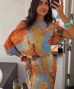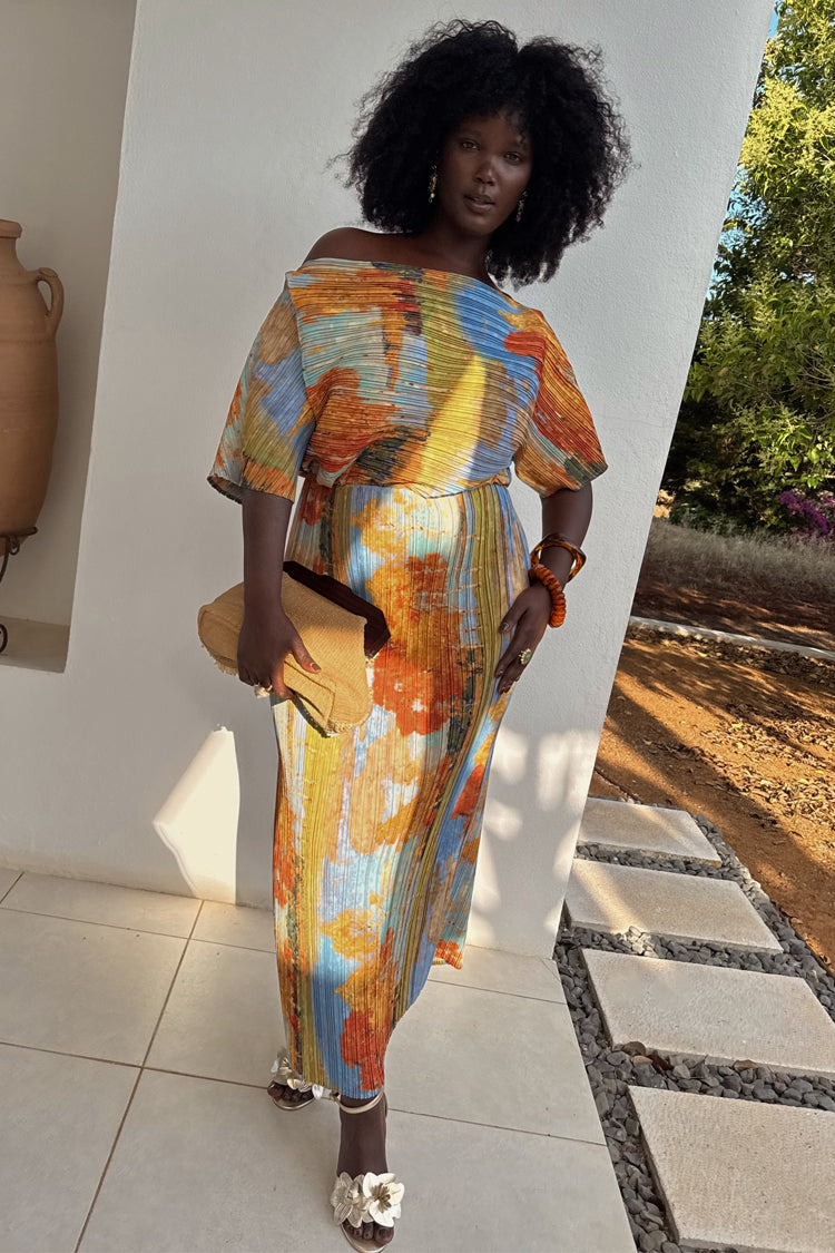 Our best selling tilly silhouette in a gorgeous multicoloured abstract print thats perfect for wedding guest dressing, adding a effortless pop of colour to your wardrobe! A fitted skirt with a slightly more voluminous top (great for bump dressing), it gives the most perfect shape for vacations, parties or summer weddings.
