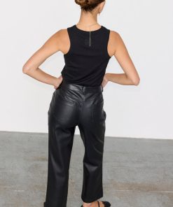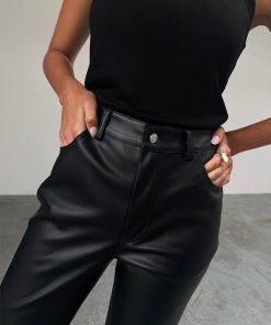 Your new go to trouser! A sleek pair of vegan leather trousers which sit high on your waist with a straight leg. Made from a super soft and slightly stretchy vegan leather. Style with tops, oversized shirts, tees and knits paired with a chunky boot or heeled sandal.