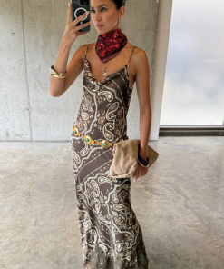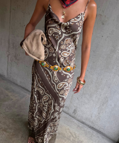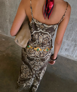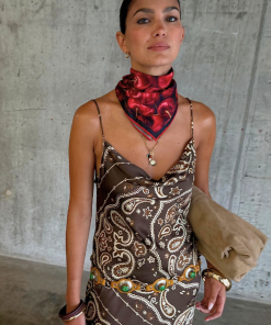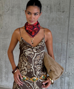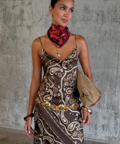 Another edition of our iconic patti dress in our new brown bandana print! A classic paisley print with black lace detailing along the hem and adjustable straps for comfortability. The lightweight, satin-esque fabric allows the dress to drape your silhouette perfectly. Keep it minimal with simple jewellery and classic heels.
