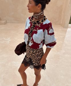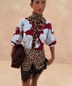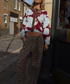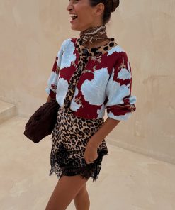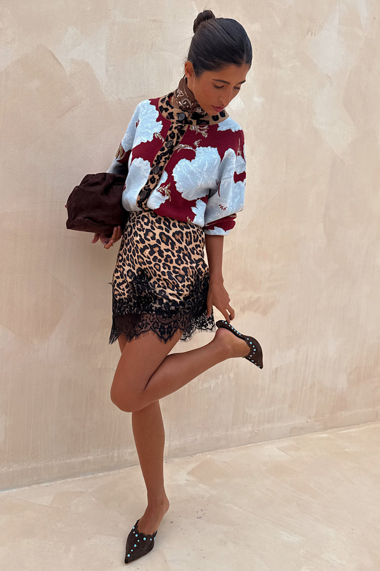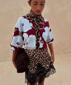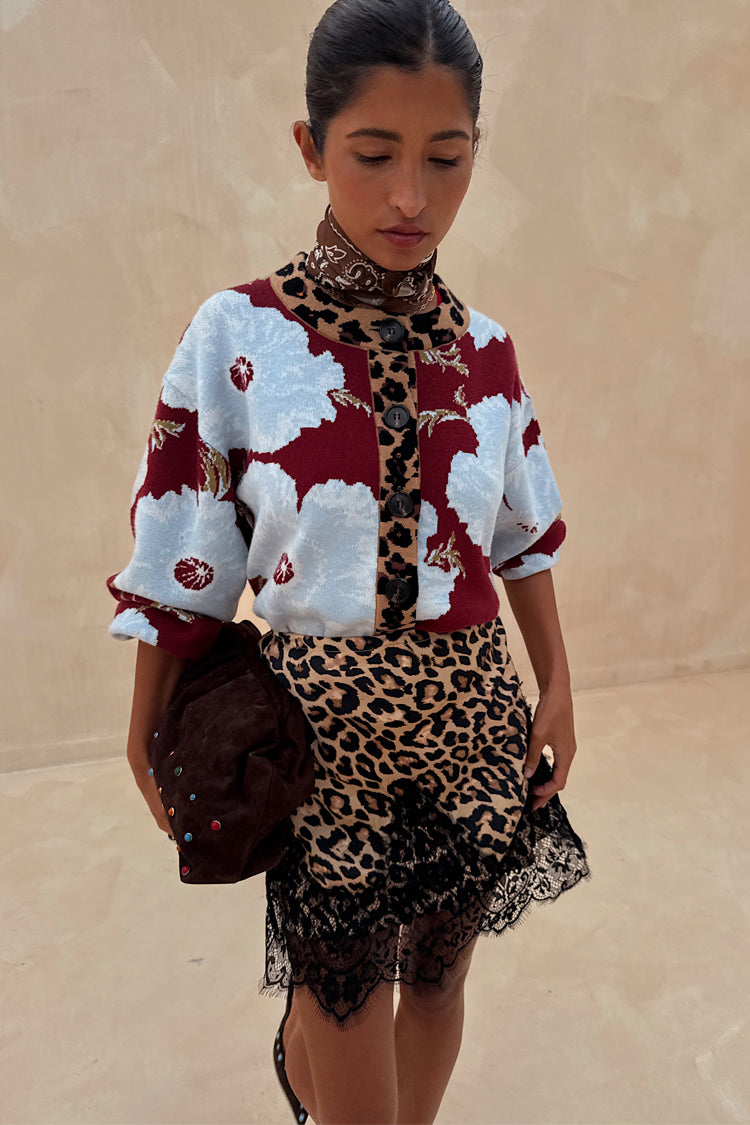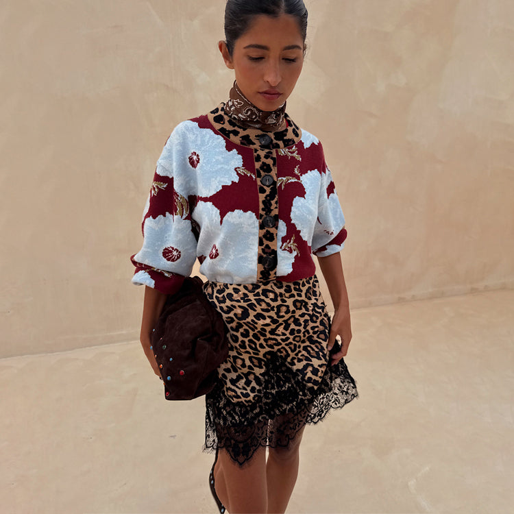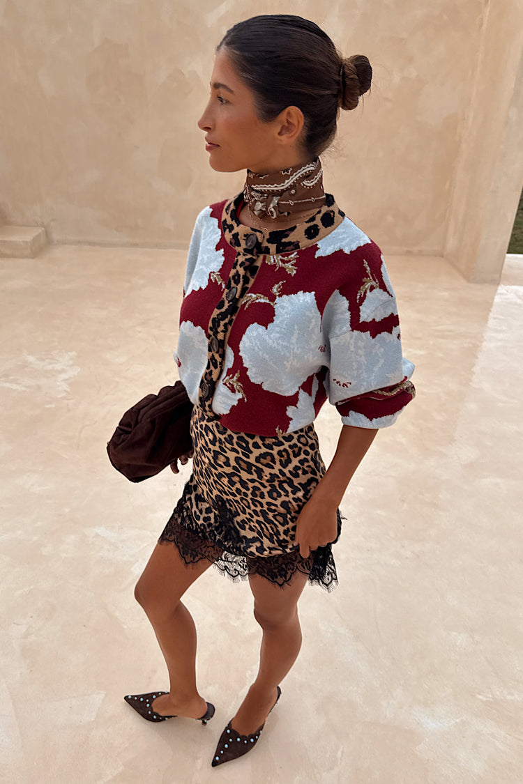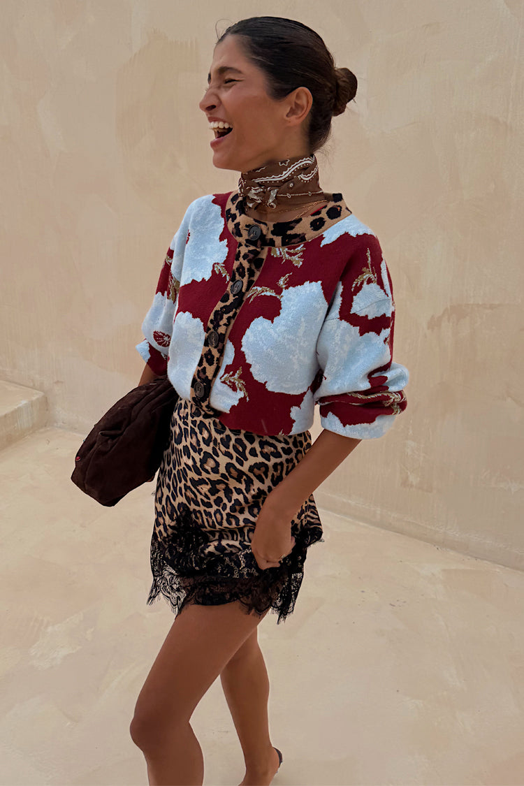 The weighty, soft touch knit fabric makes this cardigan feel so luxe and premium! A burgundy base with our iconic, bright and bold poppy print in a contrasting baby blue. With wide sleeves for a slightly oversized, boxy look and leopard print along the neckline and button stand adding an extra touch of NFD flare, pair this cardi with some barrel jeans or thrown over the matching mesh dress for a classic day to night outfit.