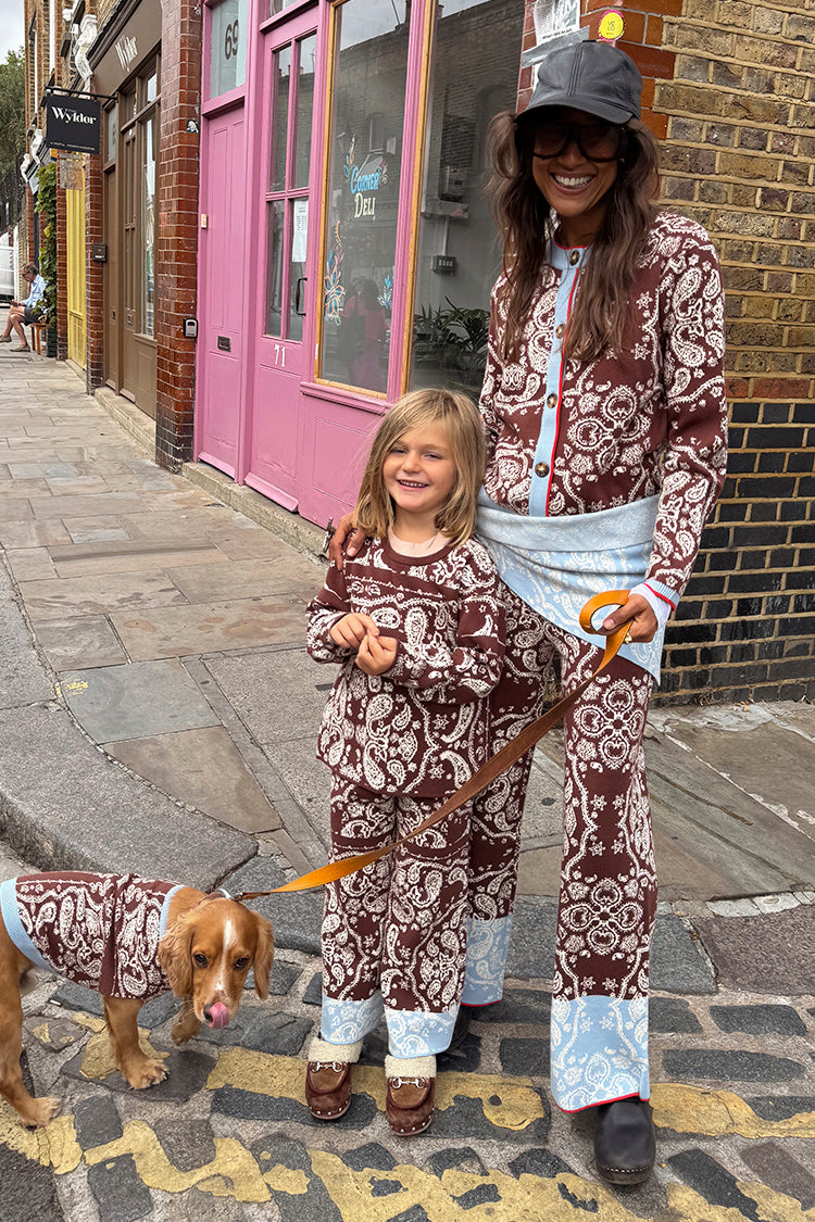 Our iconic bandana print, in a soft stretch weighty knit. With an elasticated waistband and a contrast blue hem for a luxe finish, and a pop of NFD colour! The brown and blue contrast feels so chic and paired with the matching cardi, it’s definitely an effortless everyday co-ord!
