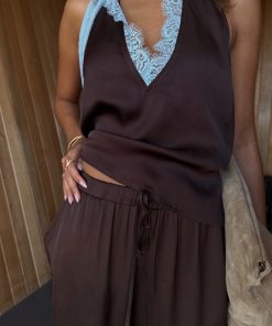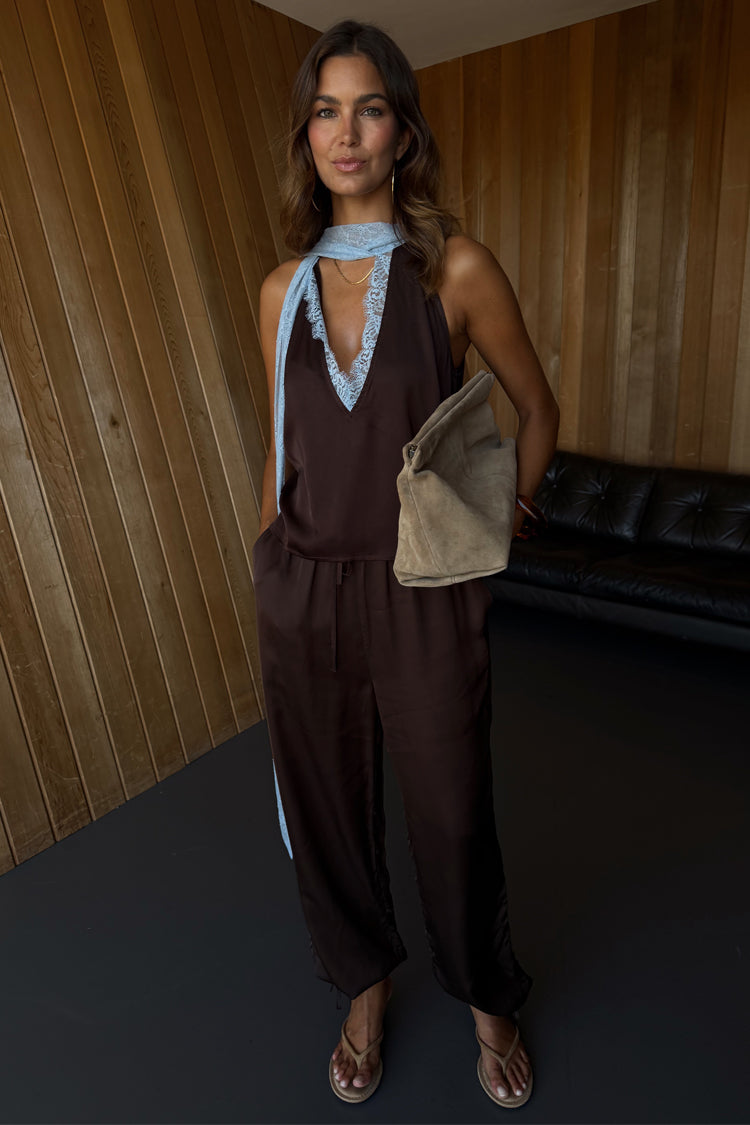 A soft satin viscose in a deep chocolate brown that works throughout the seasons! The chic balloon shape adds a unique element of structure, with an elasticated waistband for comfortability, side pockets and adjustable ties on the legs that allow you to style in a multitude of ways! Whether you’re pairing with a tank or dressing them up with the matching lace top for a night out with the girls they’re guaranteed to make a statement!