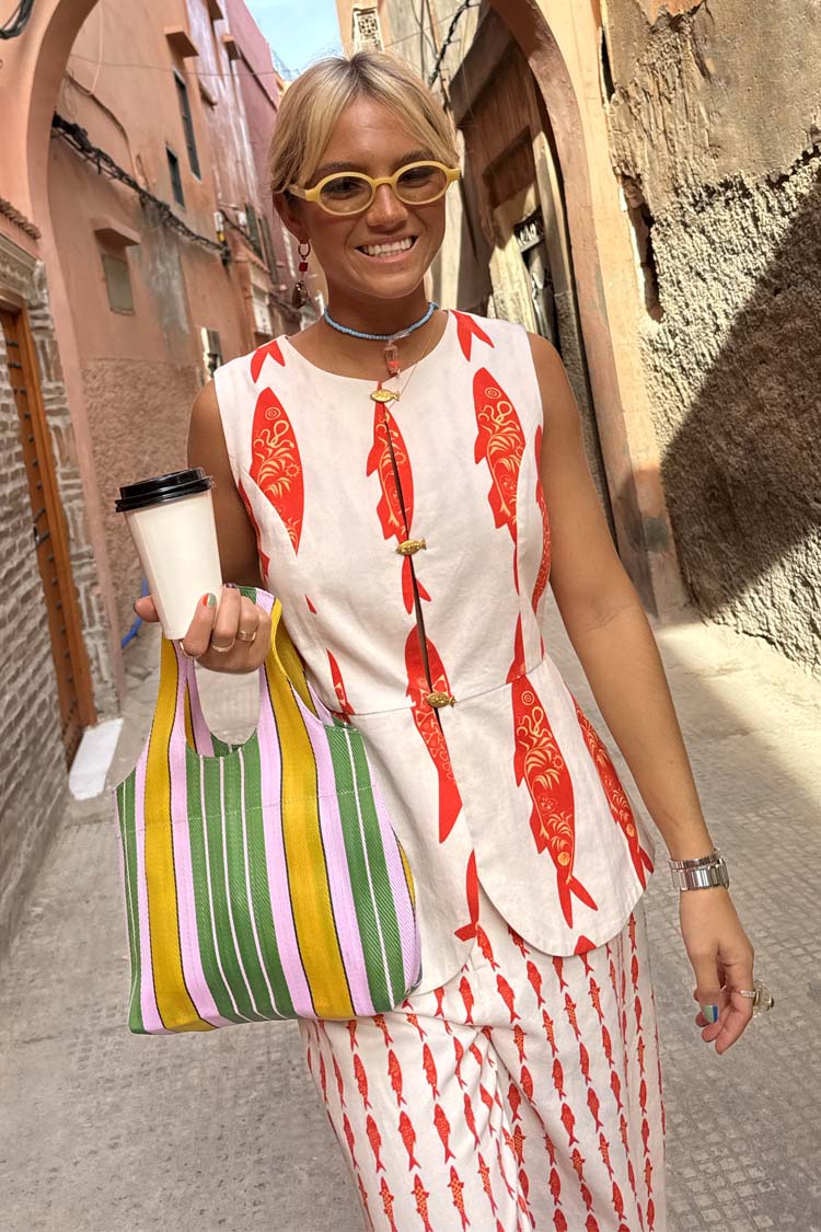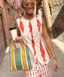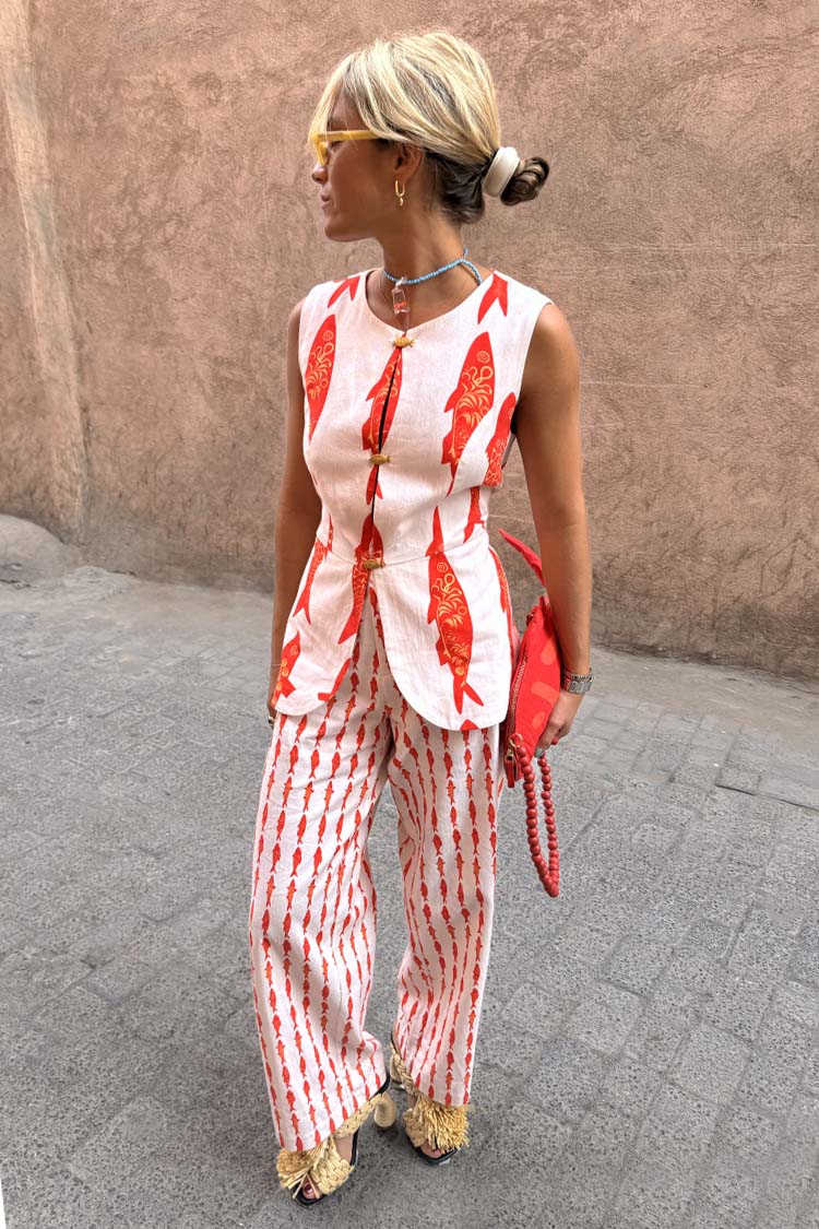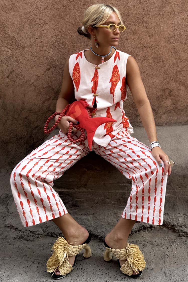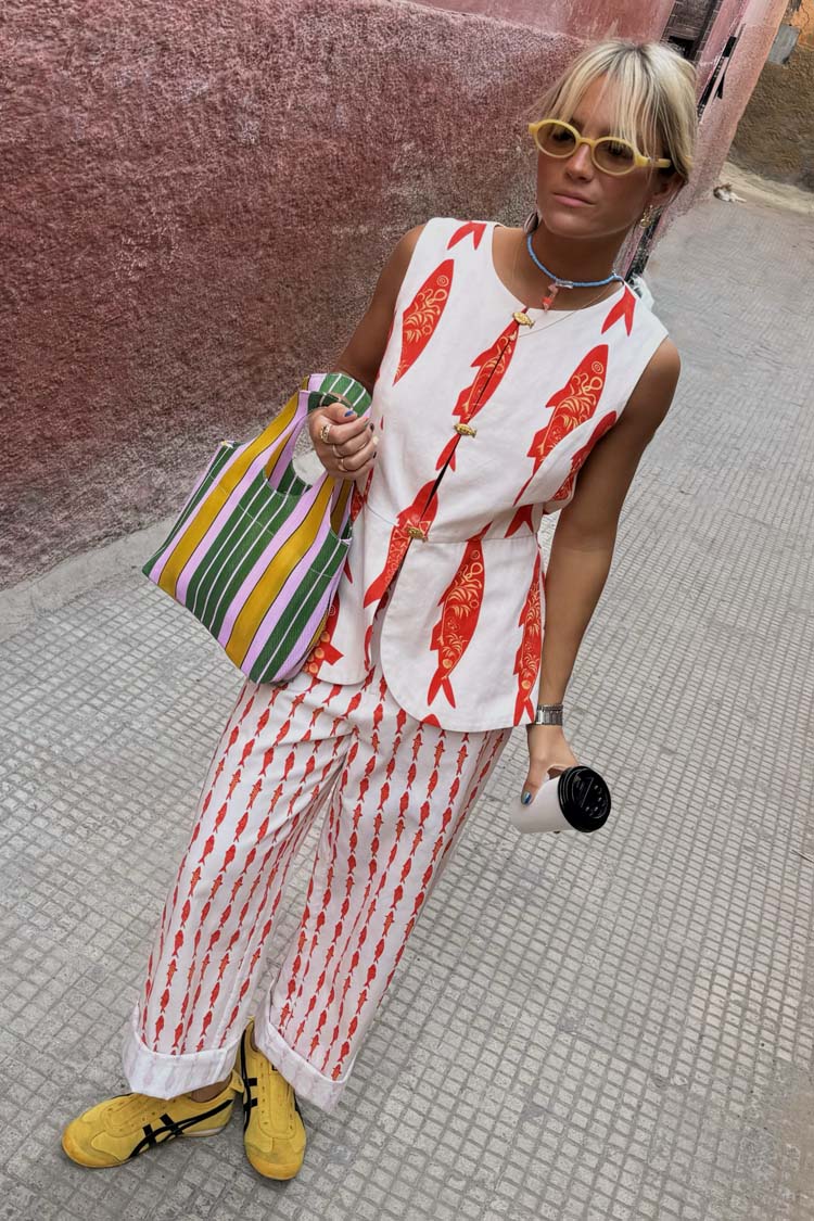 The silhouette of this waistcoat is so sleek, it fits in all the right places and is the perfect smart casual outfit. This collection is focused around showcasing our bright toned signature prints against natural fabrics. Our gorgeous fish print, featuring shell and palm motifs in a contrast yellow, paired with the lightweight cotton base makes it a must have holiday item! We’ve styled with the matching marra trousers for a more structured look however you can soften the outfit by. adding the red marina dorris skirt.