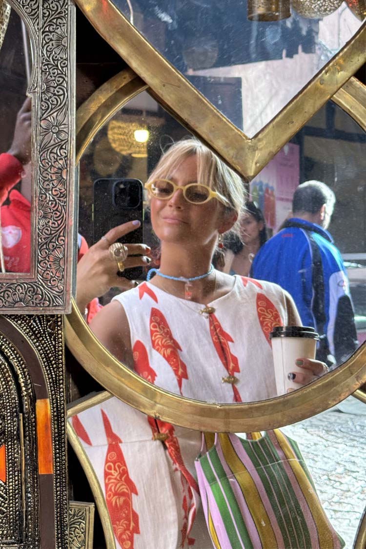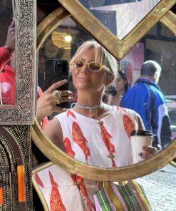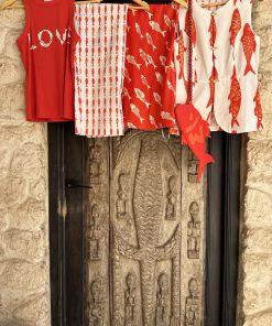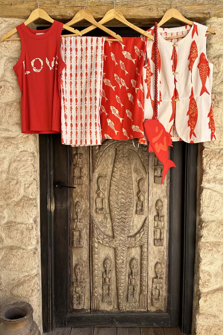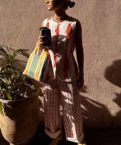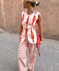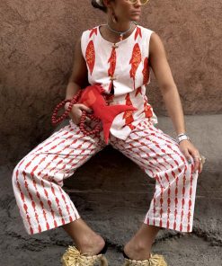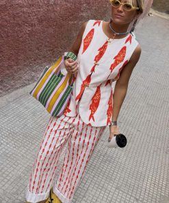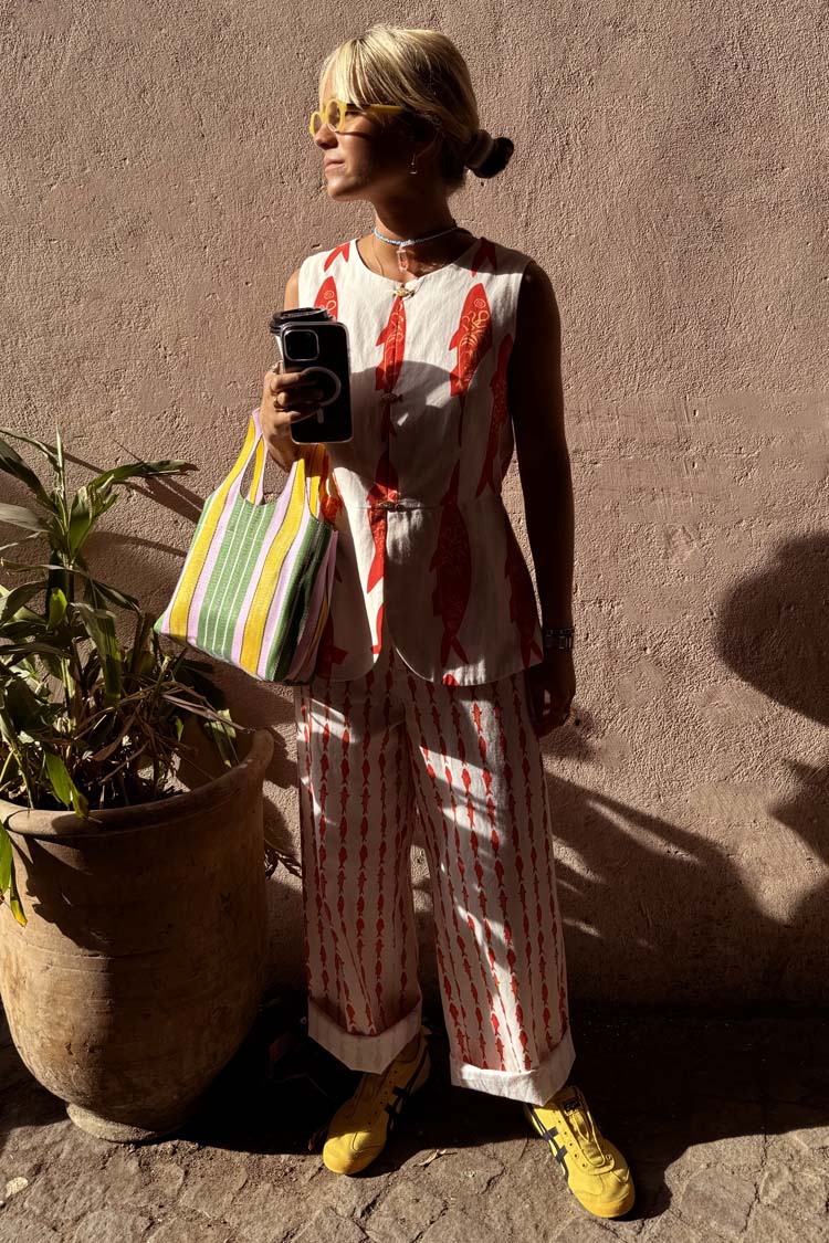 The silhouette of this waistcoat is so sleek, it fits in all the right places and is the perfect smart casual outfit. This collection is focused around showcasing our bright toned signature prints against natural fabrics. Our gorgeous fish print, featuring shell and palm motifs in a contrast yellow, paired with the lightweight cotton base makes it a must have holiday item! We’ve styled with the matching marra trousers for a more structured look however you can soften the outfit by. adding the red marina dorris skirt.