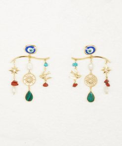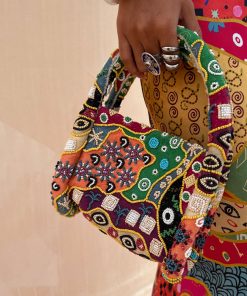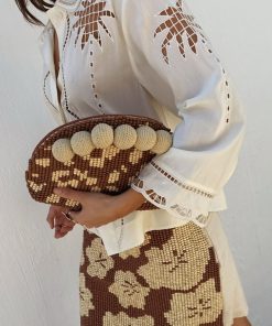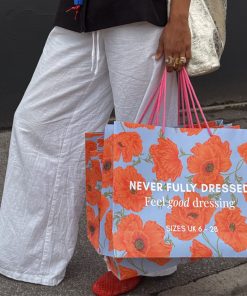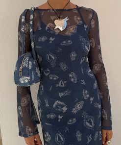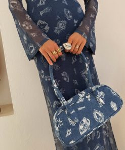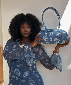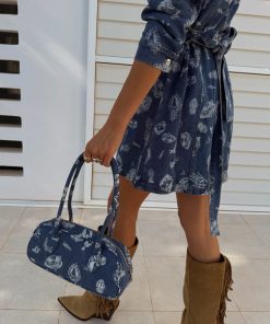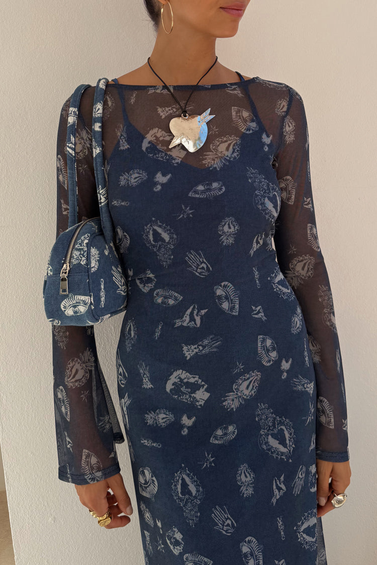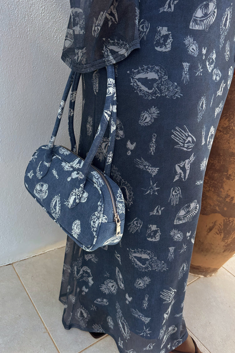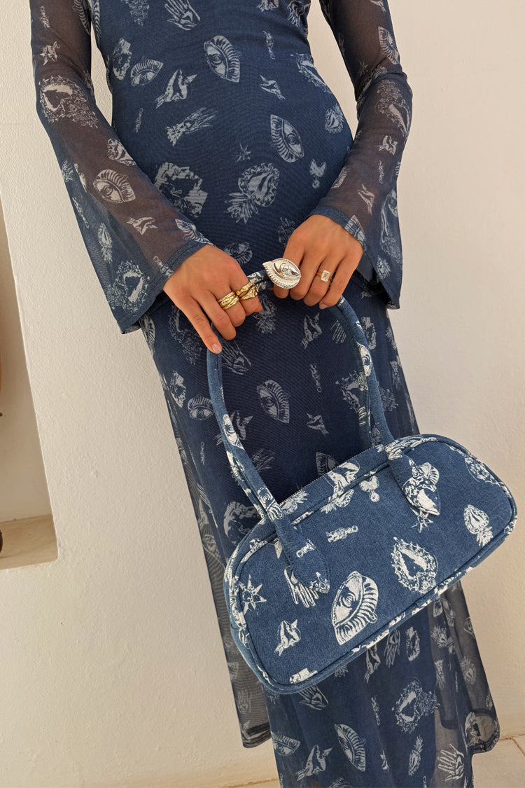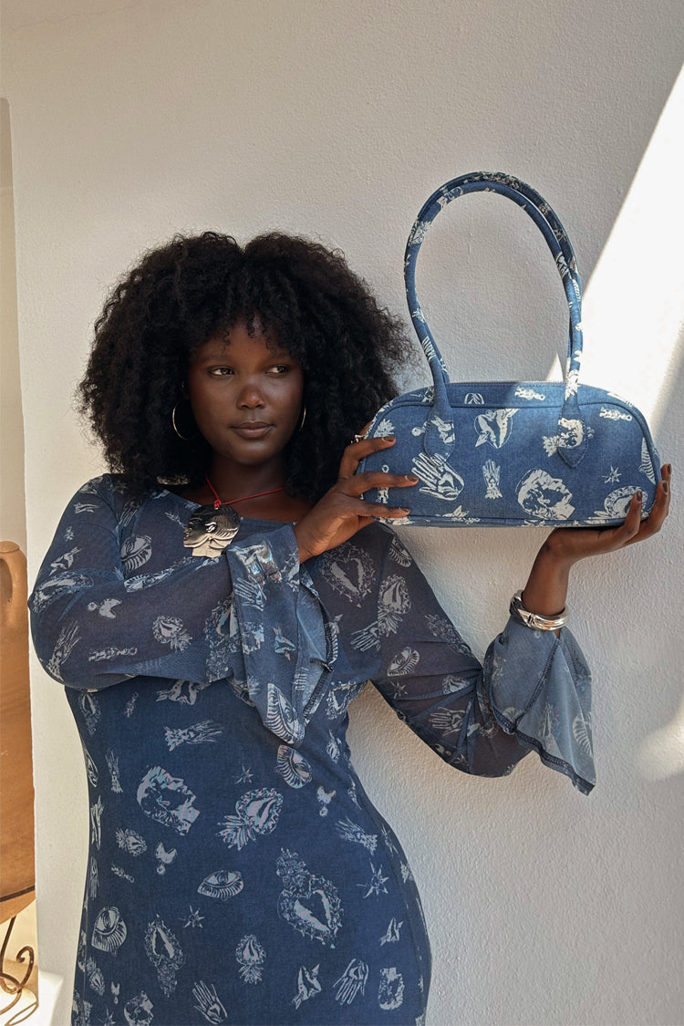 In a soft denim base, printed with mystical motifs scanned and painted from hand crafted printed tin jewellery created by our very own founder, Lucy! The structured baguette silhouette allows for a spacious interior that’s perfect for keeping your day to night essentials. Style with the matching deloris dresses or clash with prints and textures for that signature NFD vibe!