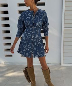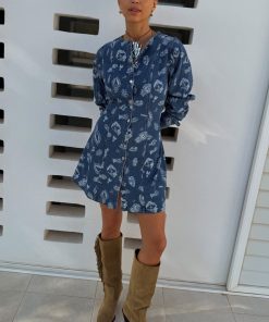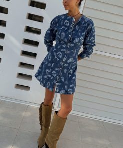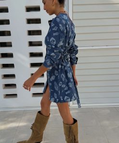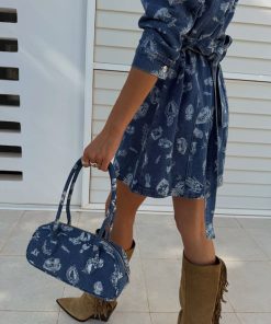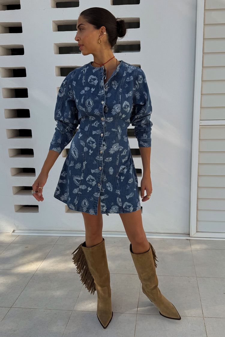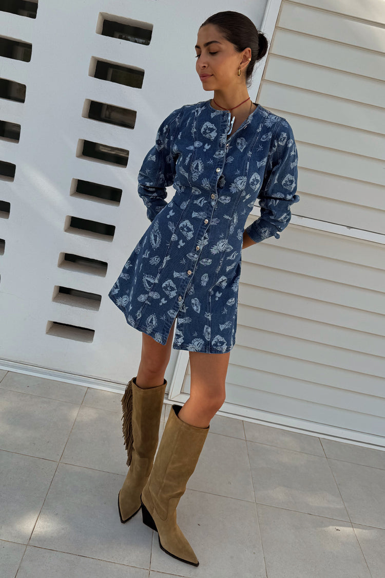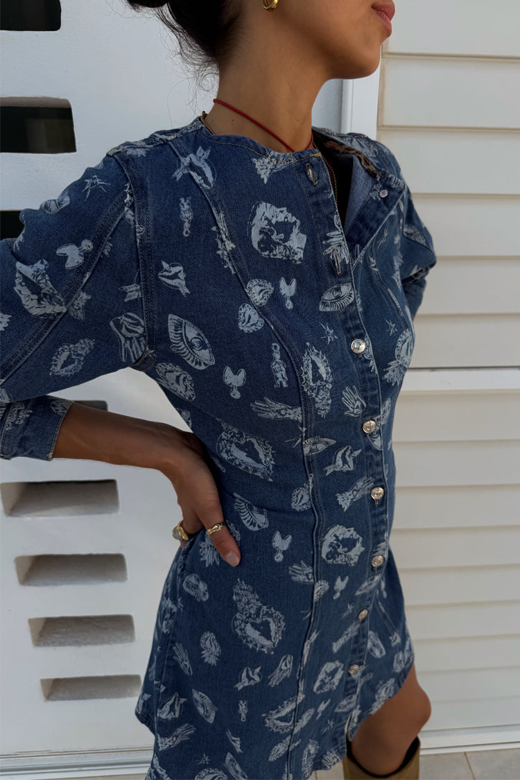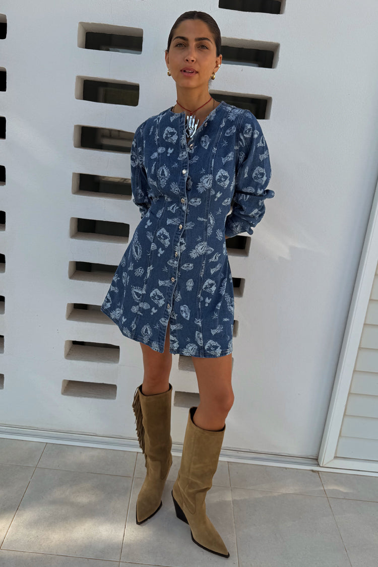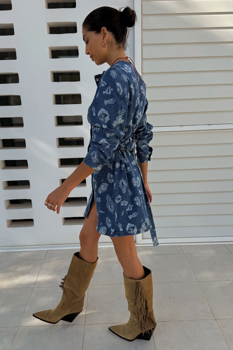 NFD are all about elevating simple silhouettes and the details on this dress definitely turn the simple structure to a staple summer look! In our new deloris print, featuring some of our iconic hand, heart and eye NFD motifs based on hand crafted tin jewellery created by our very own founder, Lucy! With intentionally placed seams, a slight balloon sleeve and a tie waist fastening that cinches you in at the waist. We’ve paired with a cowboy boot and the matching baguette bag for an effortless day to night look!