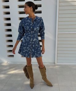 NFD are all about elevating simple silhouettes and the details on this dress definitely turn the simple structure to a staple summer look! In our new deloris print, featuring some of our iconic hand, heart and eye NFD motifs based on hand crafted tin jewellery created by our very own founder, Lucy! With intentionally placed seams, a slight balloon sleeve and a tie waist fastening that cinches you in at the waist. We’ve paired with a cowboy boot and the matching baguette bag for an effortless day to night look!