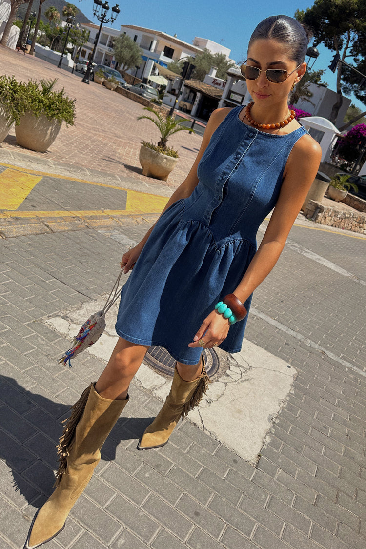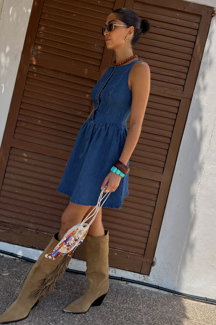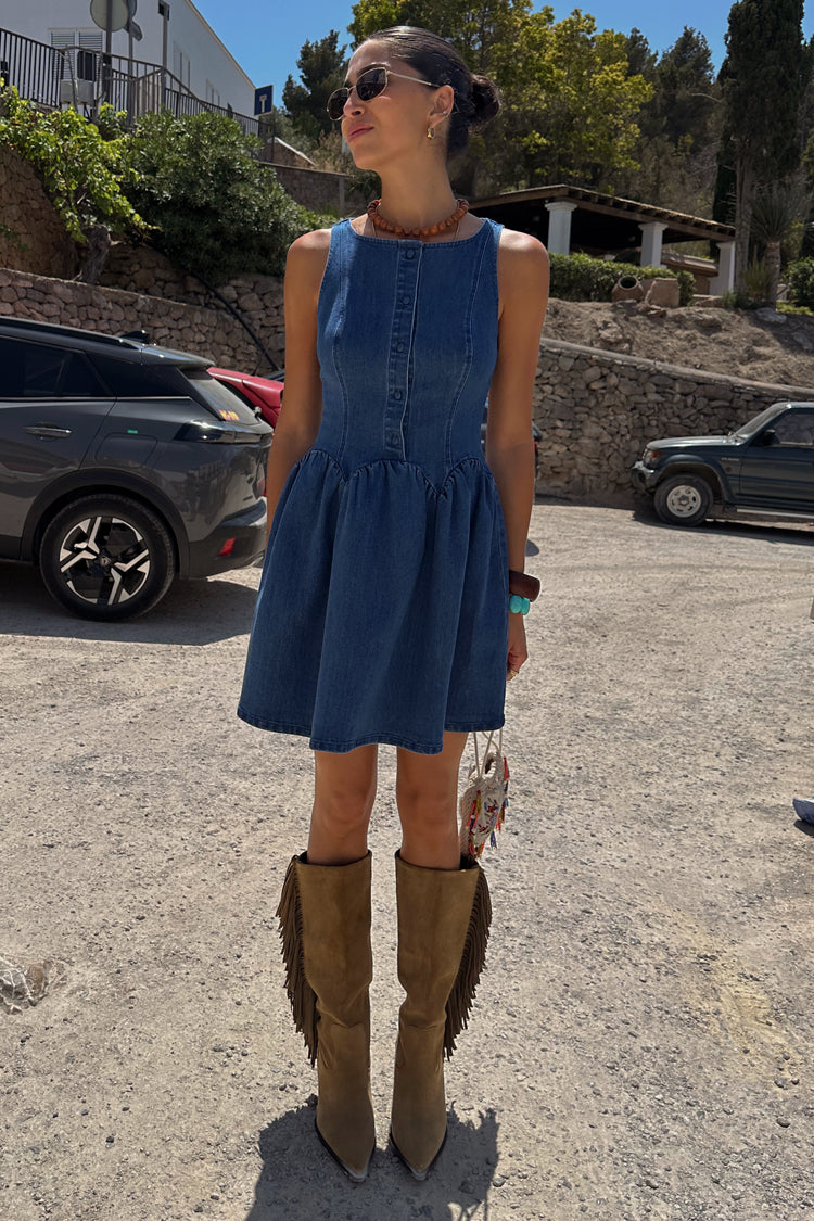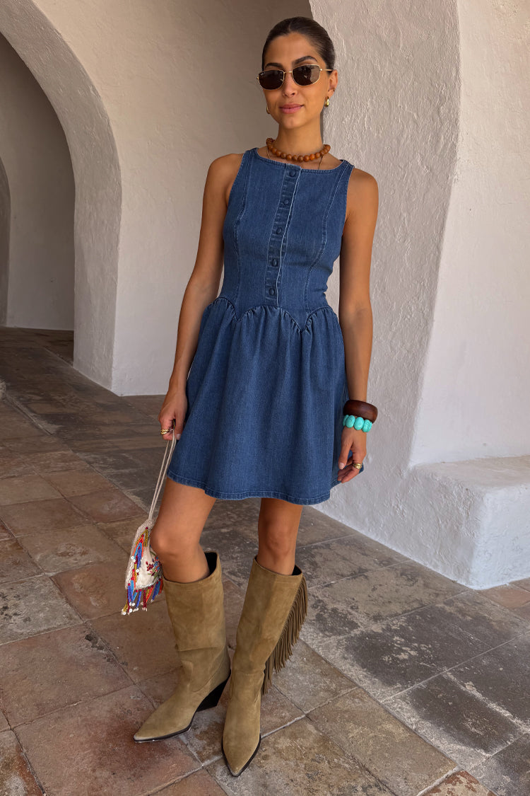 An effortlessly chic denim dress, in our best selling monika silhouette, with a panelled corset-style top, that cinches your waist to create a beautifully structured outline, which then drapes, from the scalloped edging, into a gorgeous pleated skirt. With added buttons to the front for an extra touch of detailing and to make it easier to style both ways! We’ve kept it simple with some cowboy boot and sunnies for any easy day to night look.