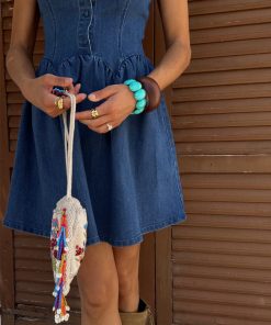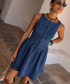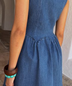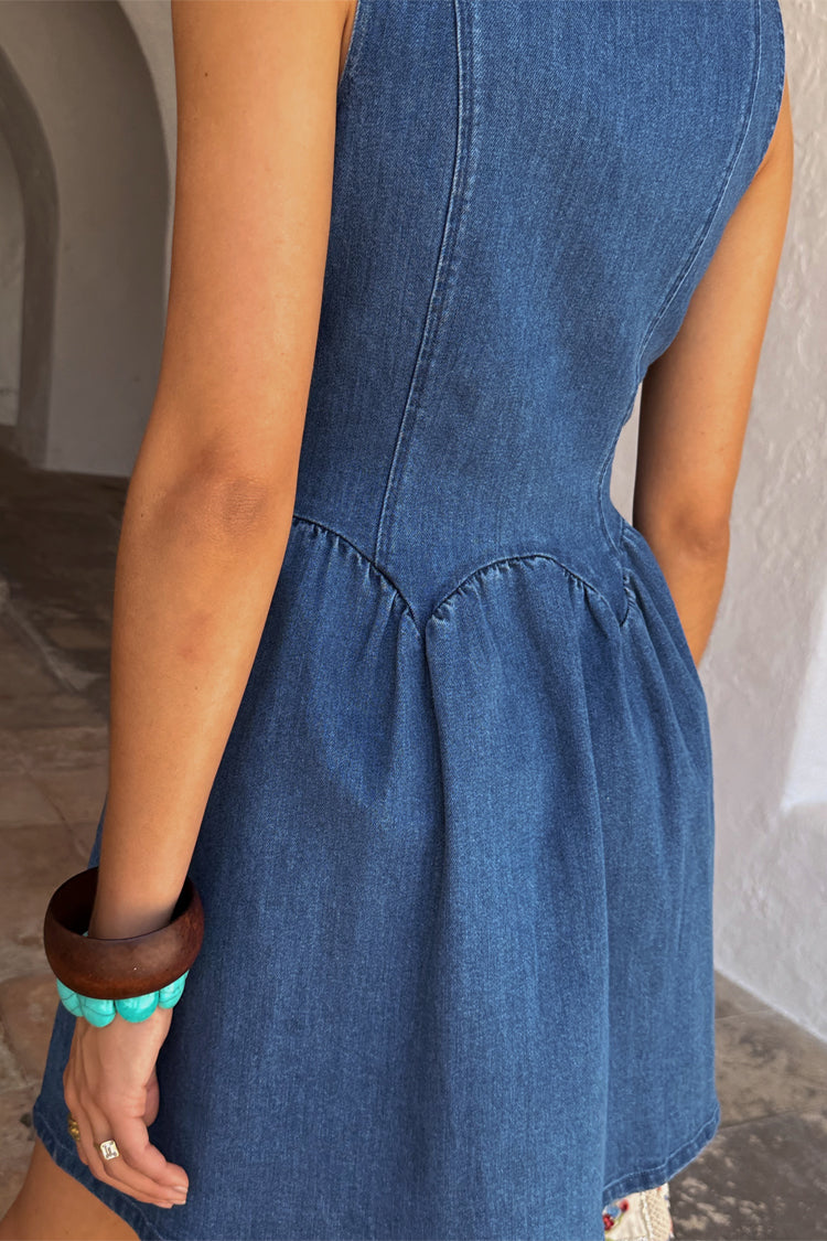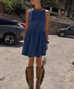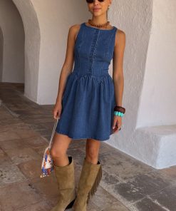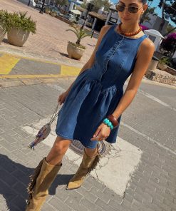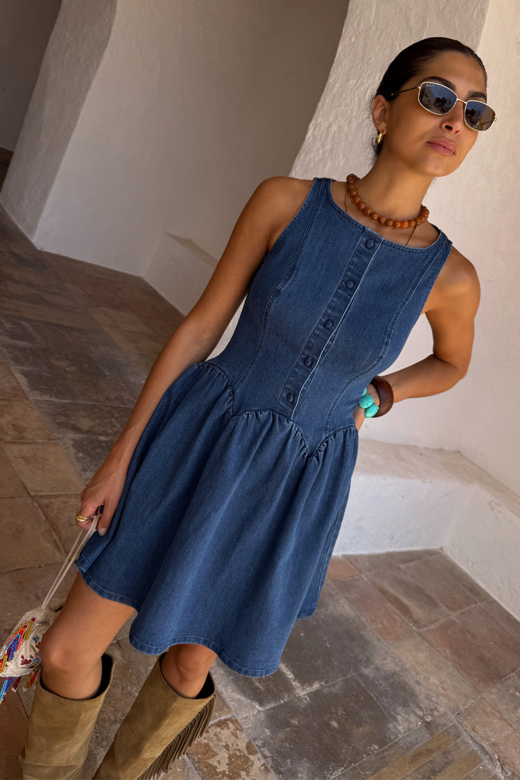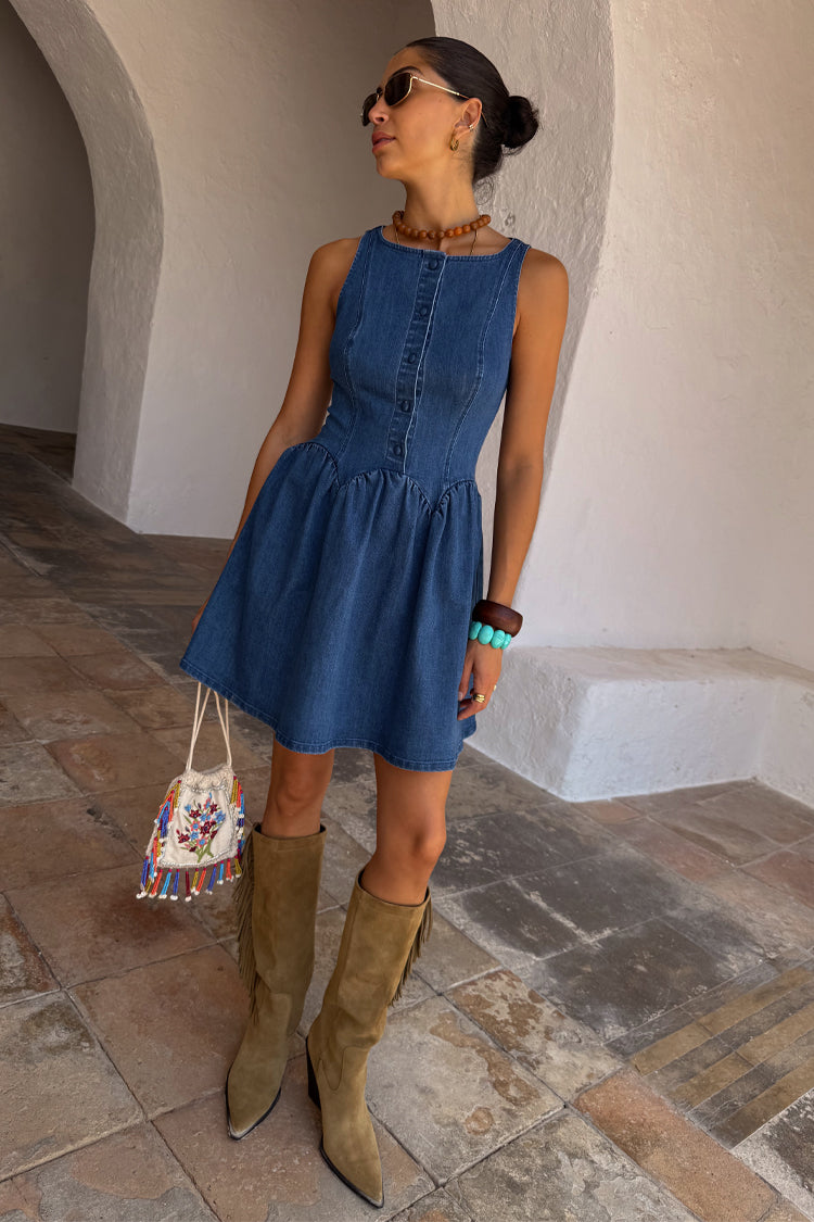 An effortlessly chic denim dress, in our best selling monika silhouette, with a panelled corset-style top, that cinches your waist to create a beautifully structured outline, which then drapes, from the scalloped edging, into a gorgeous pleated skirt. With added buttons to the front for an extra touch of detailing and to make it easier to style both ways! We’ve kept it simple with some cowboy boot and sunnies for any easy day to night look.