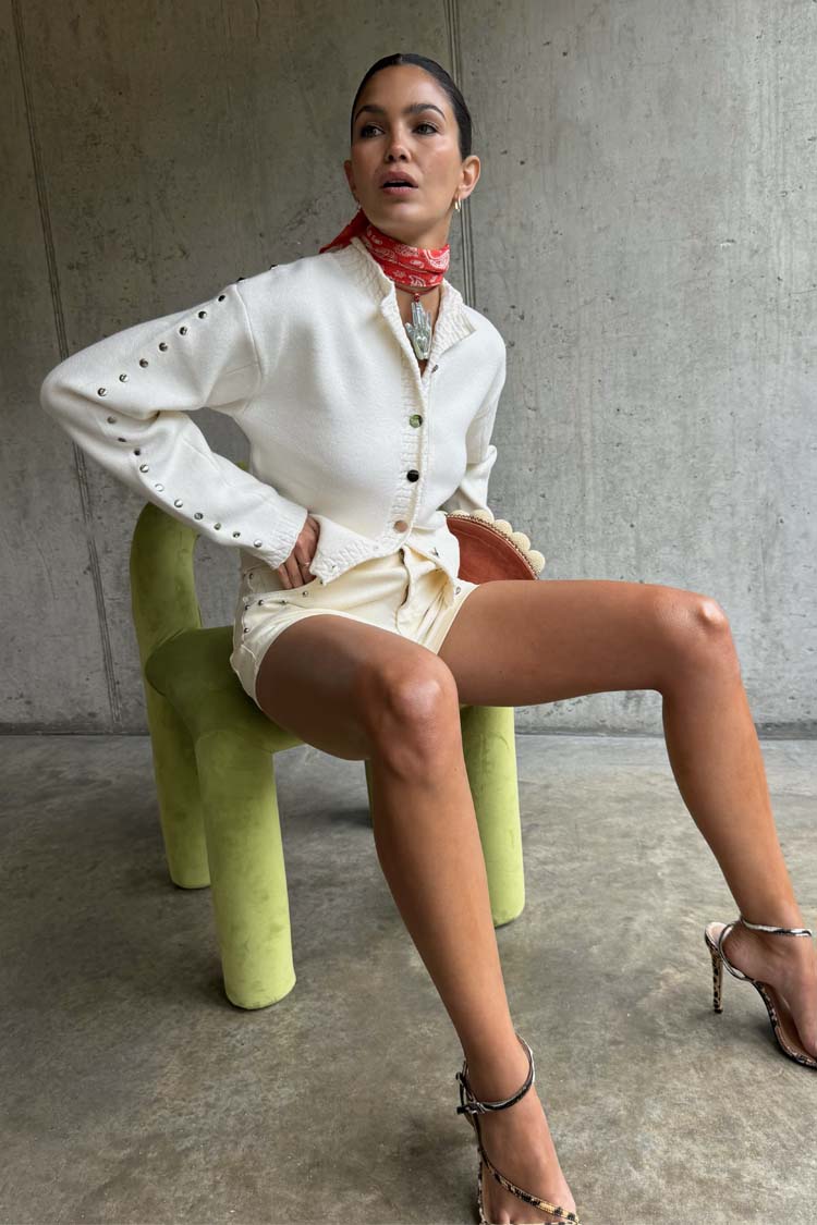 Our stud range is our new way of elevating basic silhouette’s with a pop of texture and sparkle! With silver metal studs along the sleeves and on the back, adding that extra NFD touch, as well as twist stitch detailing on the hems. We’ve also added small darts on the front and back of the cardi to create a more structured look. Pair with the matching jeans for a easy monochrome outfit.