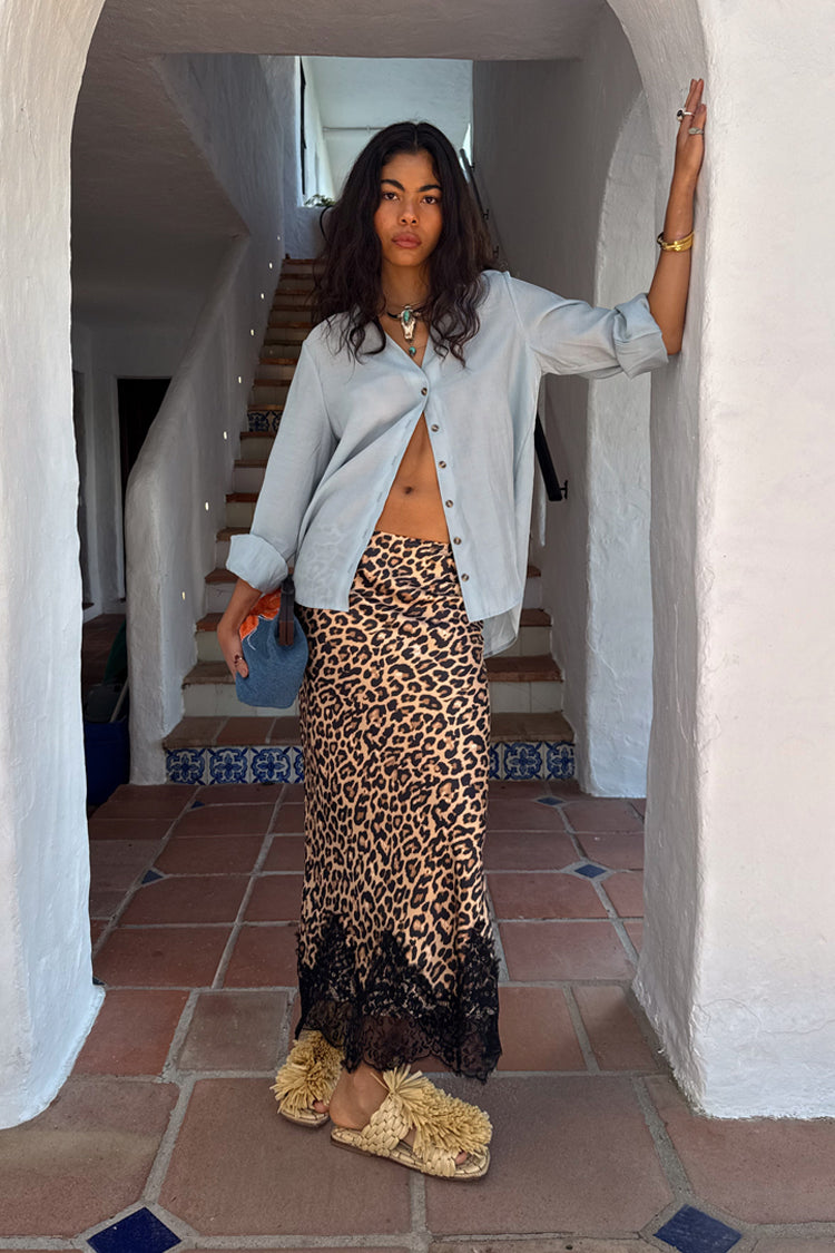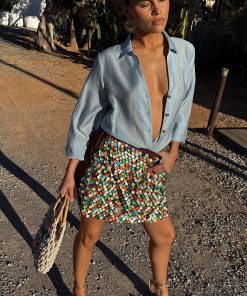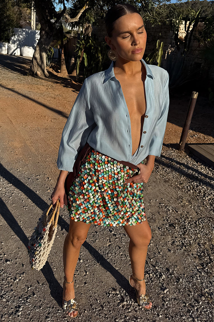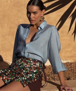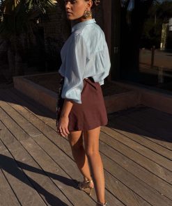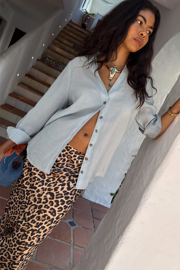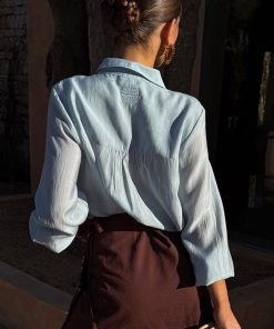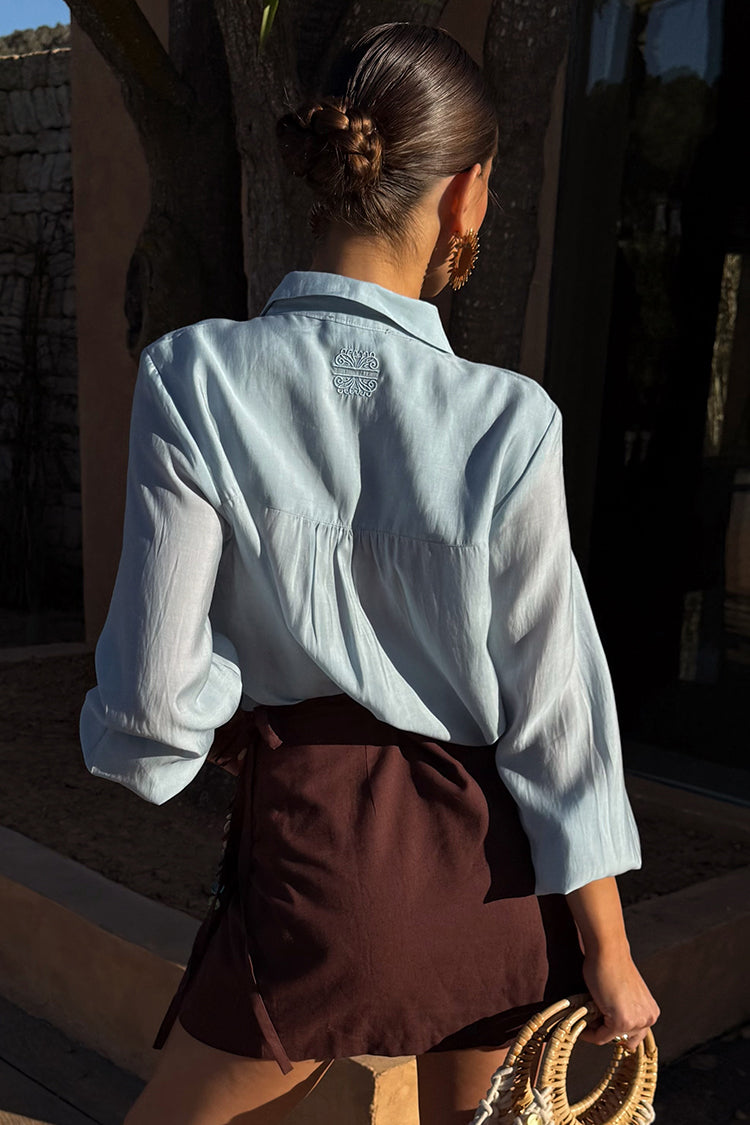 A super wearable sky blue shirt, with blouson sleeves and a floaty silhouette. A very slight sheerness for a luxe and lightweight feel but solid enough for everyday work wear. We have added contrast tortoise buttons for an extra touch of interest and gorgeous embroidered logo on the back neck.