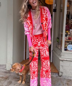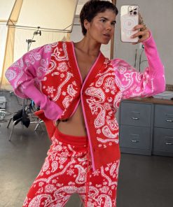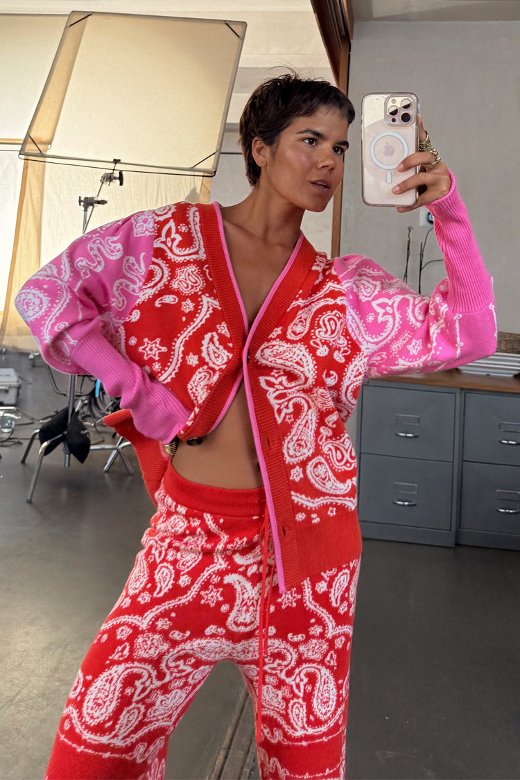 This cardi is the epitome of feel good dressing and the perfect way to add some colour to your autumn wardrobe! The super soft knit base feels effortlessly luxe and premium, in our OG bandana print on a contrast red and pink base! Keep it simple and layer over some scallop jeans or for an easy co-ord pair with the matching joggers.