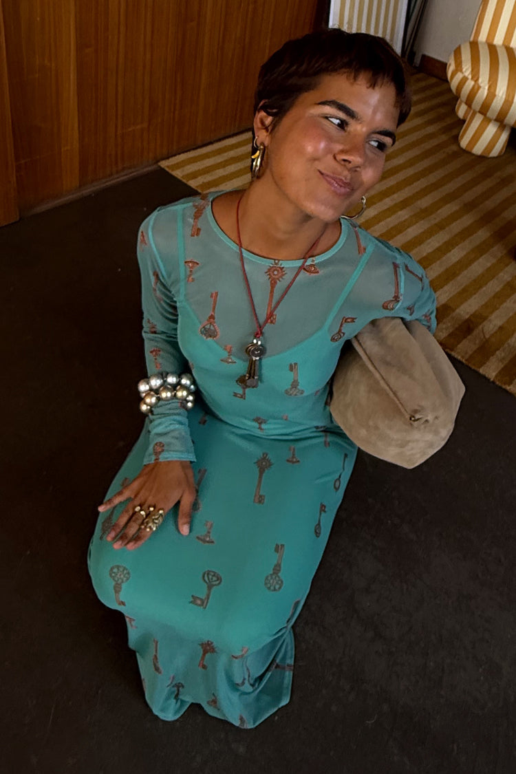In our bestselling mesh fabric, designed and created in the UK, with lots of stretch and movability. A subtle turquoise base with our new key print, hand painted and inspired by intricate little charms found at Kempton market. The silky soft base makes it the perfect dress to be worn throughout the seasons, layer over underwear for a slightly sexier approach or add some coverage with the slip and pair with some kitten heels for an easy office to evening look. The fit is so flattering, it really skims the curves and defines the waist.