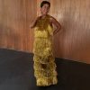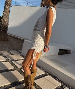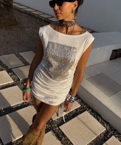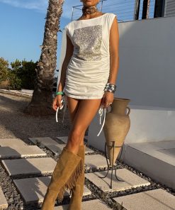 This dress is bringing the festival chic vibes to your summer wardrobe! In a relaxed t-shirt silhouette with adjustable ruching along the sides that can be tightened/loosened for your comfortability. The wider neckline allows you to style slightly off shoulder while the sequin embroidery adds an element of texture and sparkle to the simple silhouette! We’ve styled with cowboy boots and a bandana for an effortless day to night look.