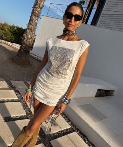 This dress is bringing the festival chic vibes to your summer wardrobe! In a relaxed t-shirt silhouette with adjustable ruching along the sides that can be tightened/loosened for your comfortability. The wider neckline allows you to style slightly off shoulder while the sequin embroidery adds an element of texture and sparkle to the simple silhouette! We’ve styled with cowboy boots and a bandana for an effortless day to night look.